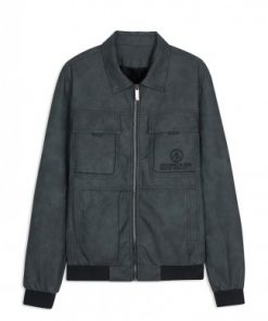 GREY LEATHER JACKET WITH 2 BOX POCKETS WITH LEFT CHEST PRINTING