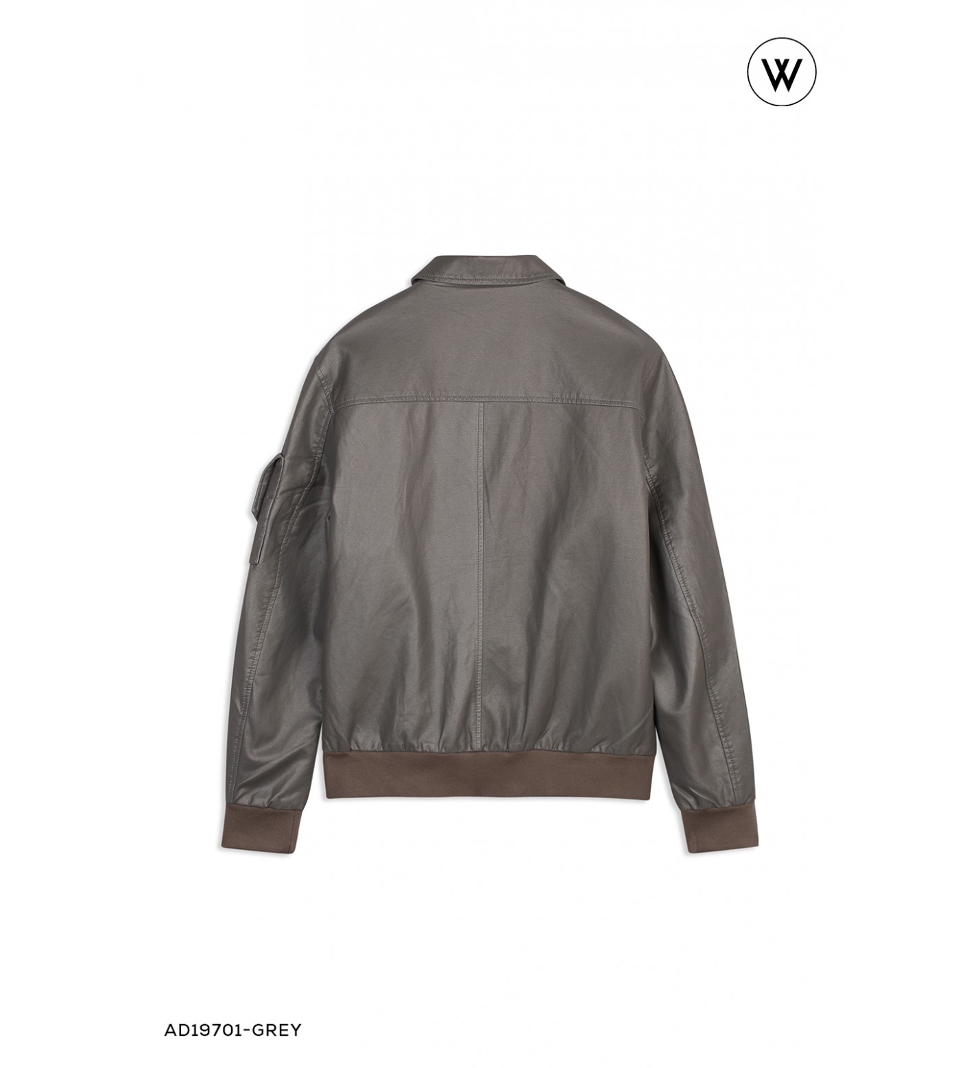 GREY LEATHER JACKET WITH TURN-DOWN COLLAR, BUTTONS, Ruffled Cuffs
